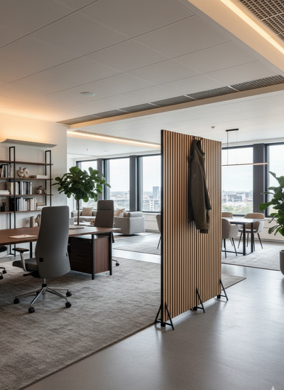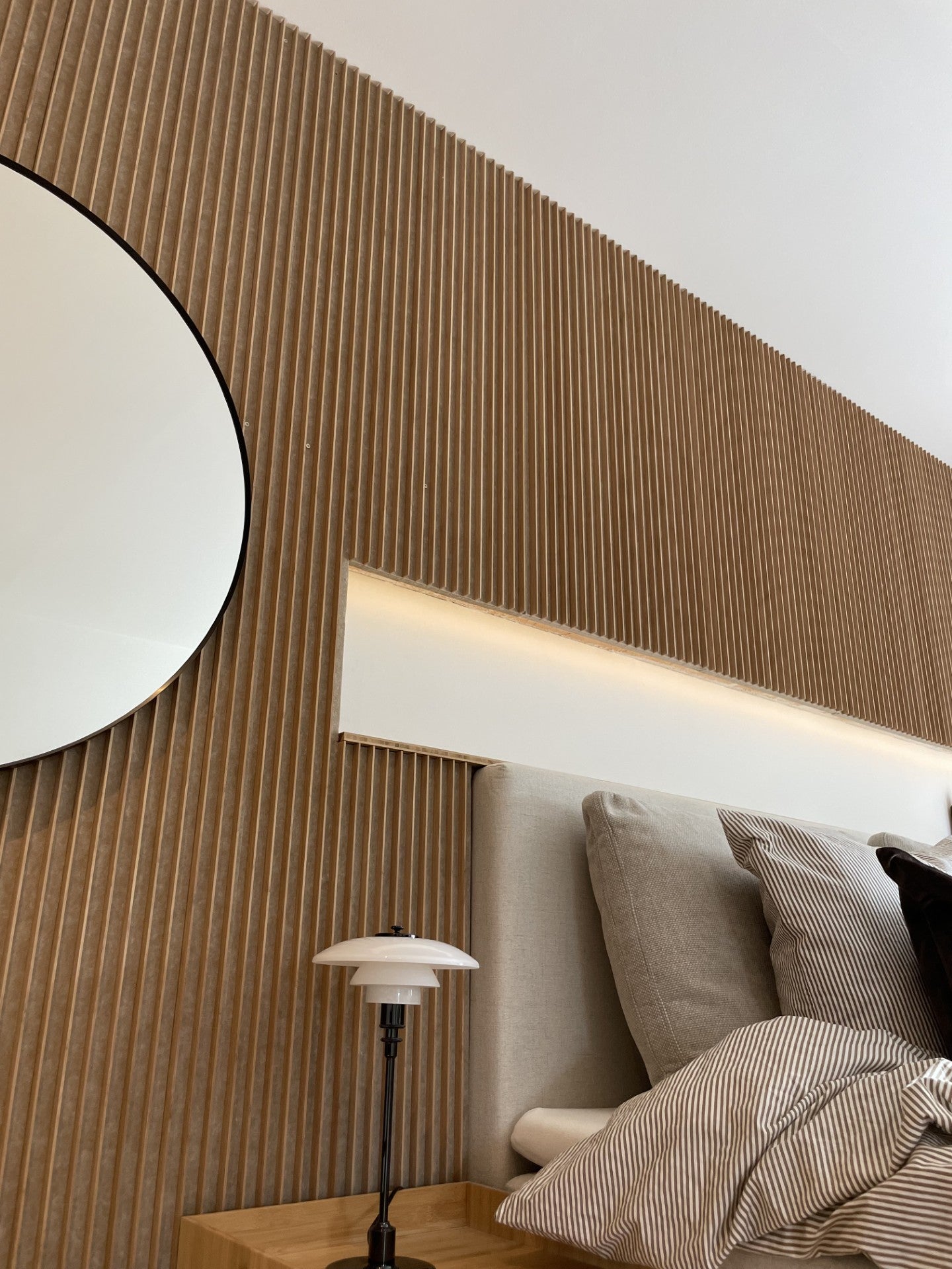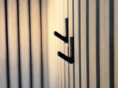 hjem og professionelle omgivelser. Den sorte, hvide eller grå filt bag trælamellerne skaber en dybde, der